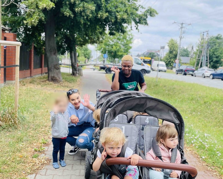 Spędzamy dużo czasu na świeżym powietrzu o każdej porze roku (nie ma złej pogody, jest nieodpowiednie ubranie) w naszym Wioskowym ogrodzie. Ze względu iż Wioska zaopatrzona jest w wózki 6 osobowe - dwa razy w tygodniu wybieramy na się na dalsze spacery oraz na pobliskie place zabaw.